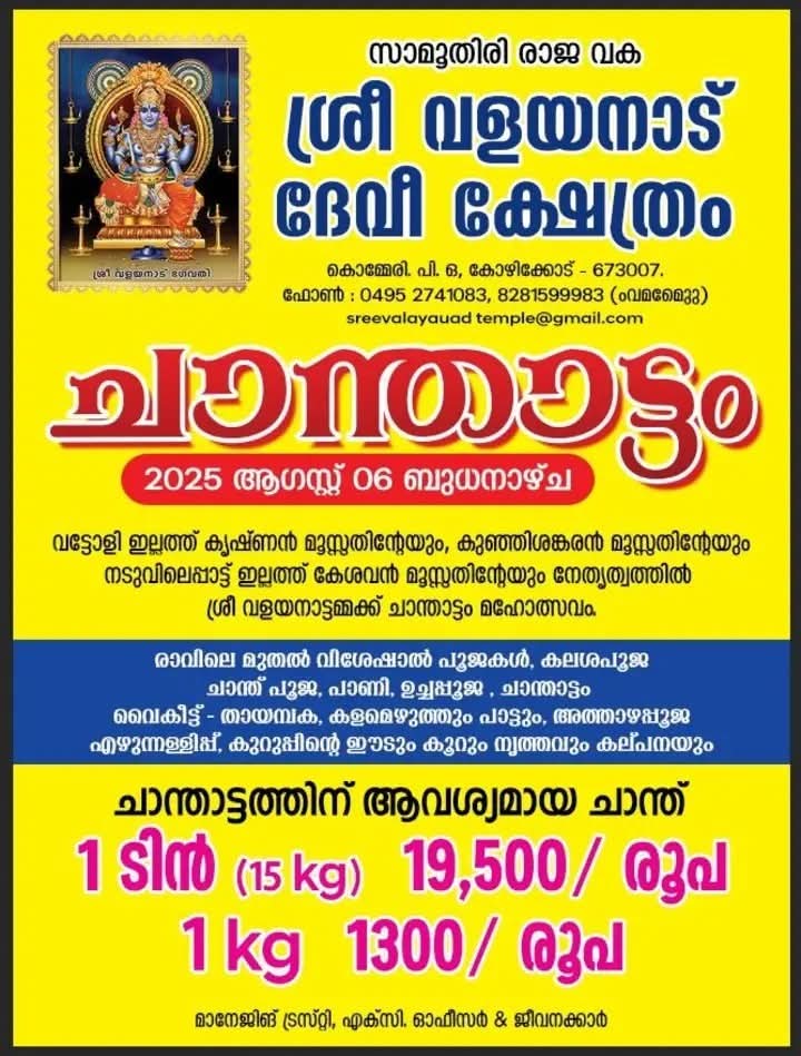 ശ്രീ വളയനാട് ദേവി ക്ഷേത്രം, ചാന്താട്ടം 2025 ഓഗസ്റ്റ് 06 ബുധനാഴ്ച. വട്ടോളി ഇലത്ത് കൃഷ്ണൻ മൂസ്സതിൻ്റെയും കുഞ്ഞിശങ്കരൻ മൂസ്സതിൻ്റെയും നടുവിലെപ്പാട്ട് ഇല്ലത്ത് കേശവൻ മൂസ്സതിൻ്റെയും നേതൃത്വത്തിൽ. ശ്രീ വളയനാട്ടമ്മക്ക് ചാന്താട്ടം മഹോത്സവം നടക്കുന്നു.